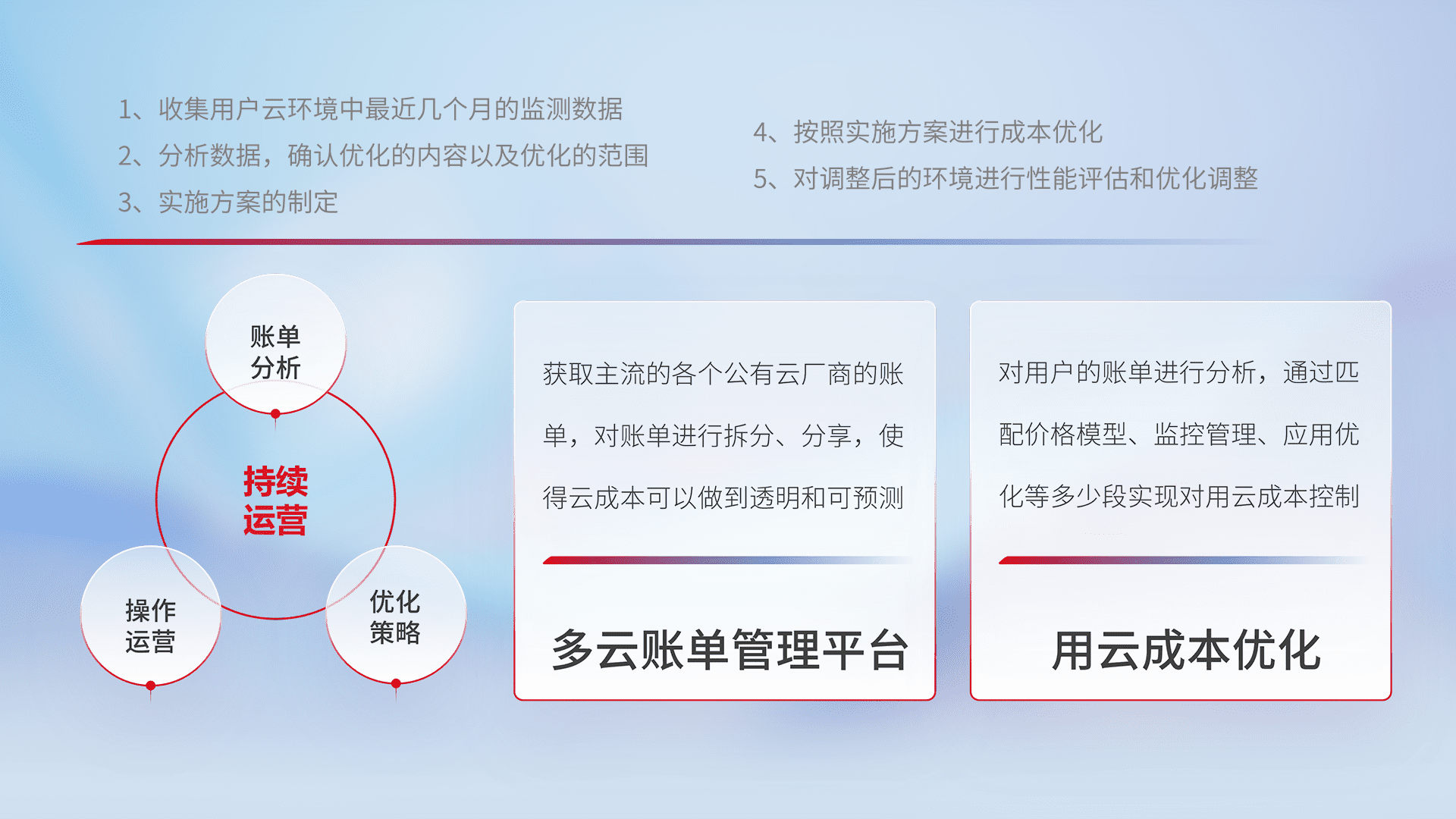 通过多云纳管,,以统一的资源数据模型把客户的云资源进行抽象和封装,,,进而实现对多云资源的统一操作,,,,保障云资源管理的可靠性、、、、稳定性与可用性。。。量身定制化运维内容,,,,配置、、、开发运维、、、、补丁管理、、、、备份、、监控、、认证和访问管理、、、、审计和日常巡检等,,保障在用云过程中的可靠度,,稳定度以及高可用率。。